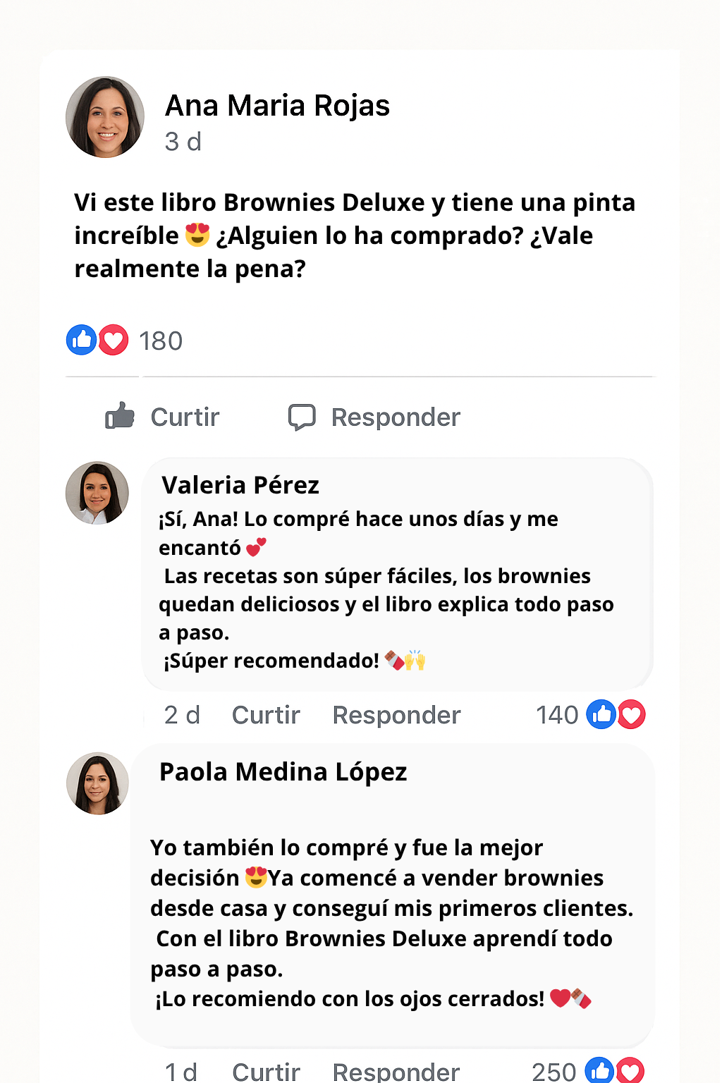 👉 A hombres y mujeres apasionados por la repostería, con o sin experiencia, que sueñan con preparar brownies de calidad profesional desde su cocina y convertir esa pasión en ingresos reales.